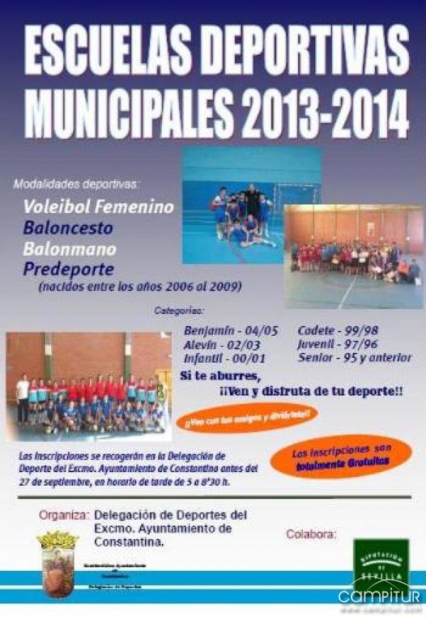 El plazo para inscribirse en las Escuelas Deportivas Municipales permanecerá abierto hasta el próximo jueves, 27 de septiembre, debiendo ser entregadas las mismas en la Delegación de Deportes del Ayuntamiento de Constantina, en horario de 17:00 a 20:30 horas.