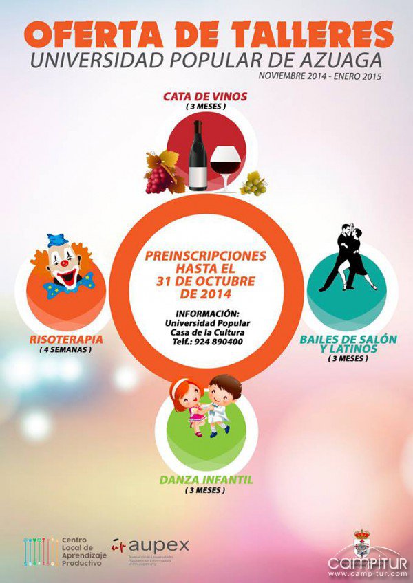 Desde Radio Azuaga informan de que el plazo para presentar las preinscripciones para los Talleres que se llevarán a cabo durante los próximos meses, noviembre 2014 a eneros 2015, organizados por la Universidad Popular de Azuaga, están abiertos.