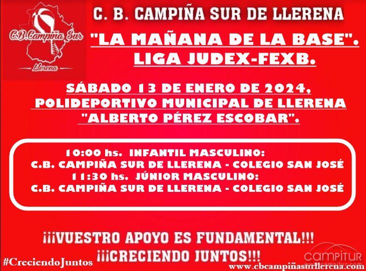Los equipos Infantil y Cadete Femeninos, jugarán la mañana del sábado 13 de enero de 2024 en la pista de C.B.A. Burguillos. Los equipos Infantil y Júnior Masculinos, jugarán el sábado "LA MAÑANA DE LA BASE" en el Polideportivo Municipal de Llerena "Alberto Pérez". ¡¡¡Os esperamos!!!