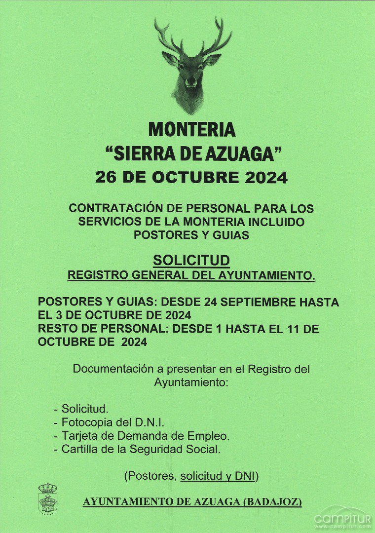 El Ayuntamiento de Azuaga ha abierto un proceso de selección de personal para los servicios derivados de la montería que se celebrará en la Finca Sierra de Azuaga el próximo 26 de octubre de 2024. Se ofertan un total de 48 puestos de trabajo temporales que se cubrirán a través de un concurso público. Las bases de la convocatoria y los detalles del proceso de contratación se encuentran disponibles en la sede electrónica del Ayuntamiento y en su tablón de anuncios.