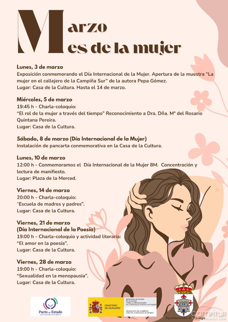 El municipio de Azuaga ha preparado una programación especial para conmemorar el Mes de la Mujer, con diversas actividades culturales y formativas a lo largo de marzo. Con motivo del Día Internacional de la Mujer (8M), se llevarán a cabo exposiciones, charlas-coloquio y lecturas de manifiestos, con el objetivo de dar visibilidad al papel de la mujer en la sociedad y promover la igualdad de género.