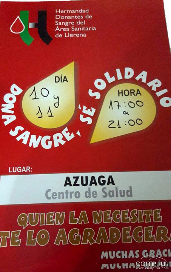 La Hermandad de Donantes de Sangre pertenecientes al Área de Salud de Llerena, estarán el próximo jueves y viernes en Azuaga.
