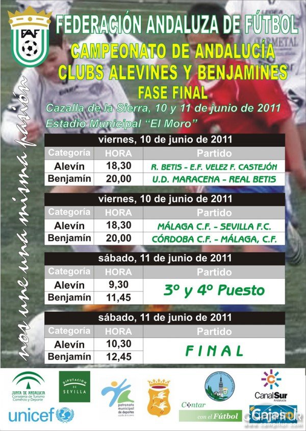 La localidad sevillana de Cazalla de la Sierra será la sede durante hoy y mañana, esto es, 10 y 11 de junio, de la celebración de la fase final del Campeonato de Andalucía Clubs Alevines y Benjamines organizado por la Federación Andaluza de Fútbol.