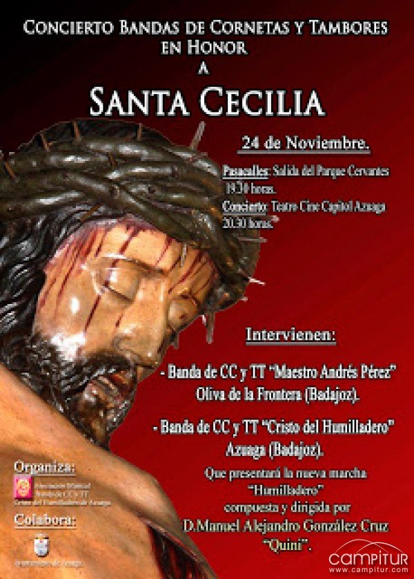 El próximo día 24 de Noviembre a las 20:30 horas en el Teatro Cine Capitol de Azuaga, la Banda de CC. y TT. Cristo del Humilladero de Azuaga, junto con la Banda de CC. y TT. "Maestro Andrés Pérez" de Oliva de la Frontera (Badajoz), ofrecerán un Concierto de Bandas de Cornetas y Tambores en Honor a Santa Cecilia, patrona de la Música.