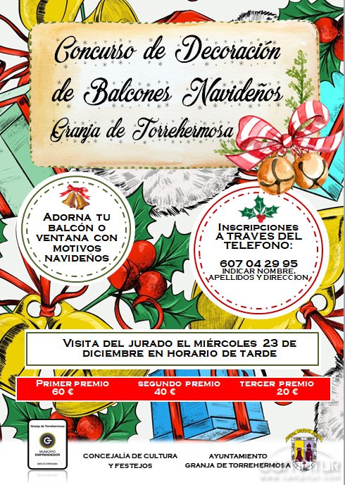 La Concejalía de Cultura y Festejos del Ayuntamiento de Granja de Torrehermosa organiza la celebración de un Concurso de Decoración de Balcones Navideños.