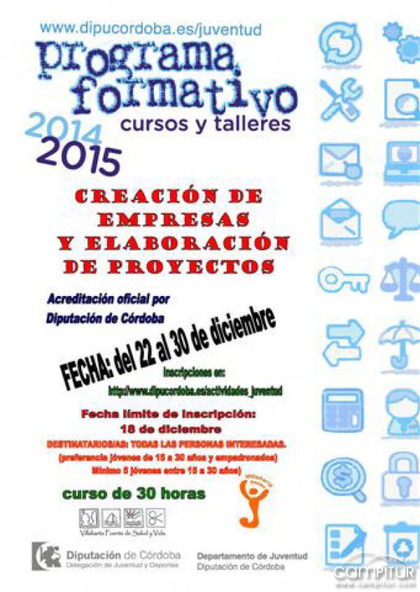 El Ayuntamiento de Villaharta, contando con la colaboración del Departamento de Juventud de la Diputación cordobesa, organiza la celebración de un curso bajo el lema “Creación de Empresas y Elaboración de Proyectos”.