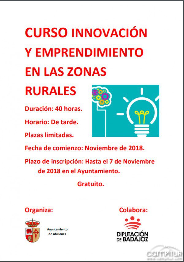 El Ayuntamiento de Ahillones, con la colaboración de la Diputación de Badajoz, organiza la impartición del Curso “Innovación y Emprendimiento en Zonas Rurales”.