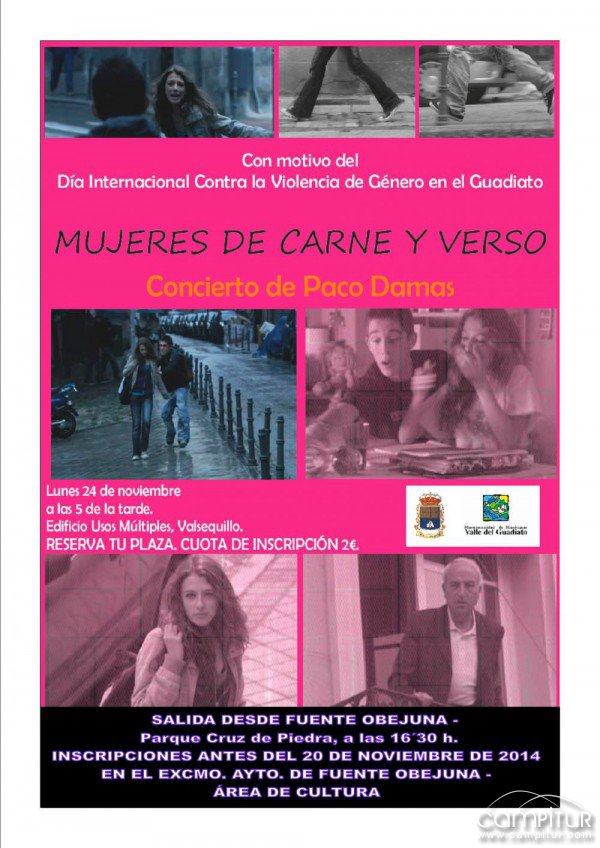 Con motivo de la celebración del Día Internacional Contra la Violencia de Género en el Guadiato, la localidad cordobesa de Valsequillo celebra un concierto a cargo de Paco Damas, bajo el título “Mujeres de Carne y Verso”.