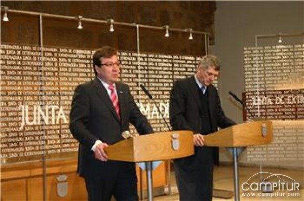El presidente de la Junta de Extremadura, Guillermo Fernández Vara, y el presidente de la Real Federación Española de Fútbol (RFEF), Ángel María Villar, han firmado en Mérida un convenio de colaboración para la construcción de 23 campos de césped artificial en la región.