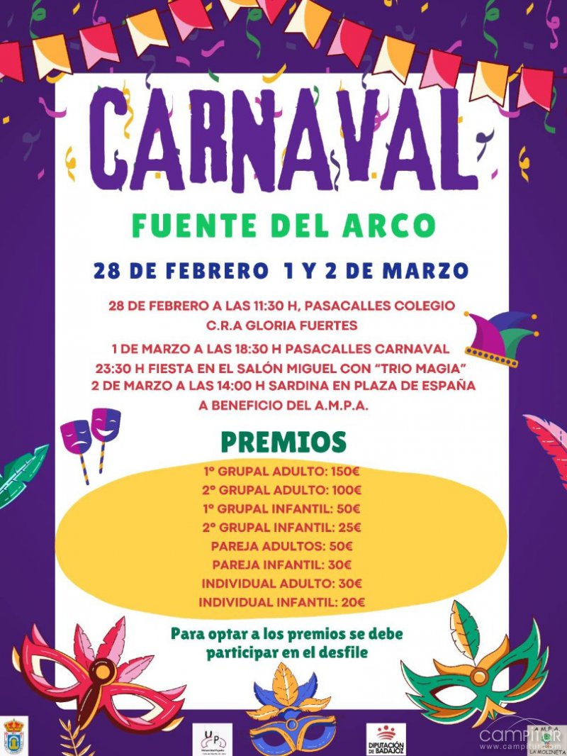 Fuente del Arco se prepara para vivir su esperado Carnaval 2025, que tendrá lugar los días 28 de febrero, 1 y 2 de marzo con una agenda repleta de actividades para todas las edades. La música, el color y la diversión estarán asegurados con pasacalles, fiesta, concursos y el tradicional entierro de la sardina.