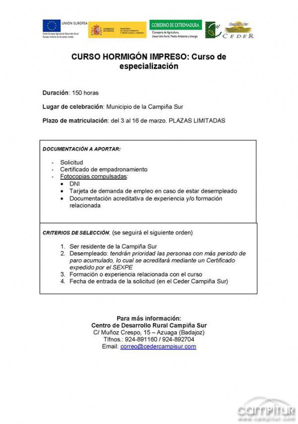 Desde el Ceder Campiña Sur se va a organizar un nuevo curso de formación, en concreto en esta ocasión se llevará a cabo un “Curso de Hormigón Impreso”,con el objetivo de facilitar, tanto a desepleados como activos, los conocimientos necesarios para desarrollarse en este sector.