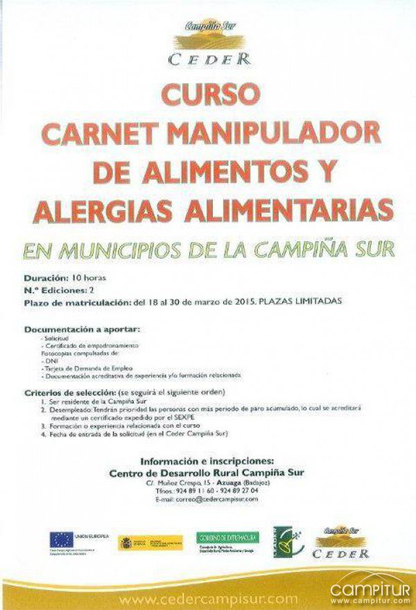 Desde el Centro de Desarrollo Campiña Sur informan que desde hoy, 18 de marzo, hasta el próximo día 30, permanecerá abierto el plazo para inscribirse al Curso Carnet Manipulador de Alimentos y Alergias Alimentarias que se va a desarrollar en nuestra comarca.