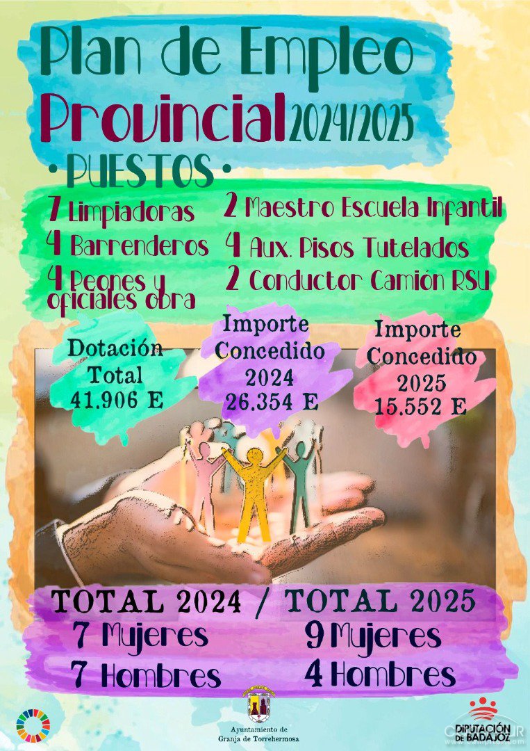 El Ayuntamiento de Granja de Torrehermosa, en colaboración con la Diputación de Badajoz, ha anunciado la puesta en marcha del Plan de Empleo Provincial 2024/2025, una iniciativa que facilitará la contratación de 23 trabajadores en diferentes categorías profesionales.