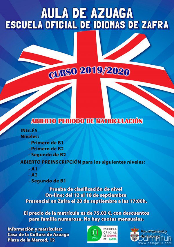 Durante el curso escolar 2019/20 se va a impartir los siguientes niveles de inglés: 1º curso de B1, 1ª y 2ª de B2. De estos niveles pueden ya realizarse la matricula.