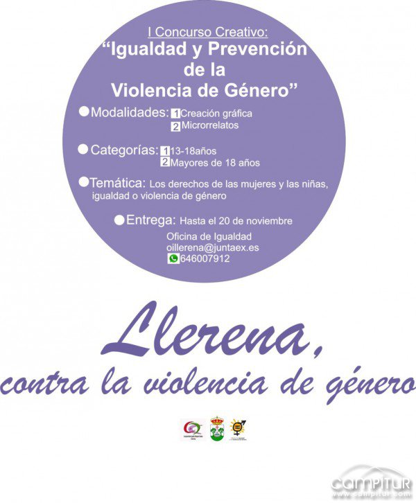 El Ayuntamiento de Llerena, a través de la concejalía de Sanidad, Igualdad y Participación Ciudadana y en colaboración con la Oficina de Igualdad de la Mancomunidad de Aguas y Servicios de la Comarca de Llerena convoca el I Concurso Creativo “Igualdad y Prevención de la Violencia de Género”.