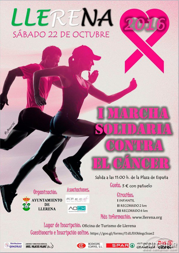 El próximo día 22 de octubre, Llerena acoge la celebración de la I Marcha Solidaria Contra el Cáncer, organizada por la Concejalía de Deporte y Sanidad del Ayuntamiento, y las asociaciones locales AOEX y AFECC.