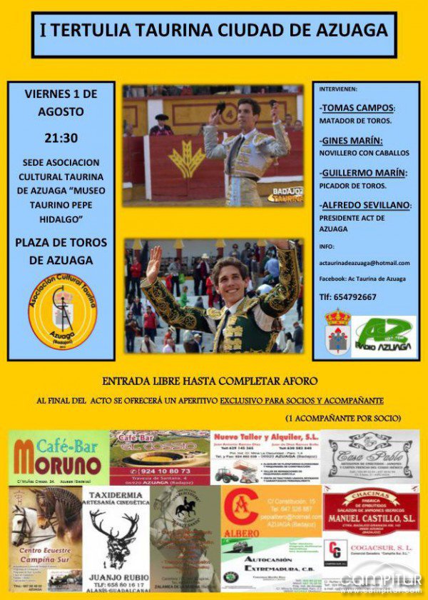 La Asociación Cultural Taurina de Azuaga organiza la celebración de su I Tertulia Taurina Ciudad de Azuaga.