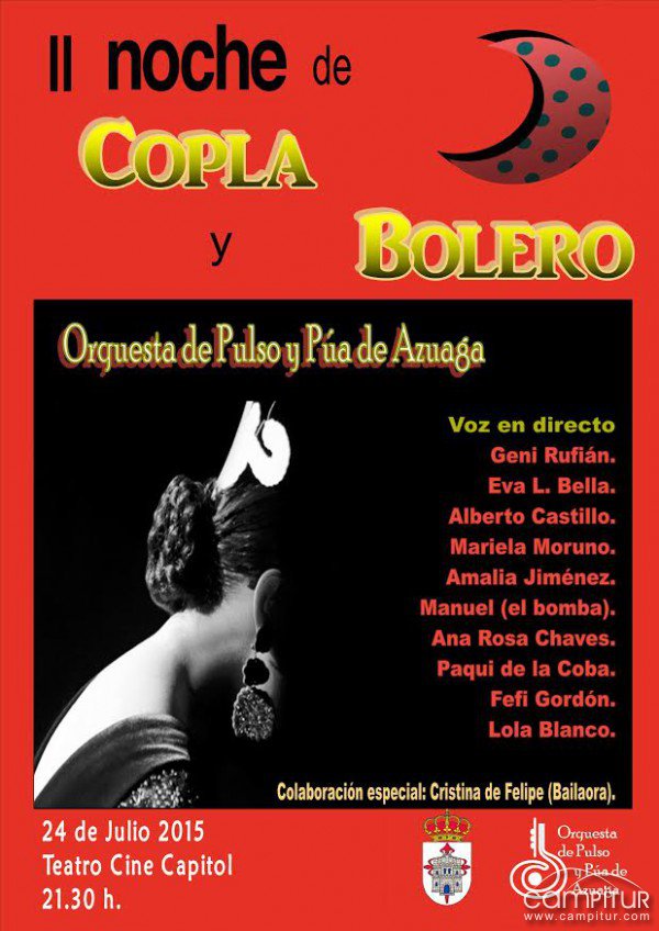 El próximo 24 de julio, la Orquesta de Pulso y Púa de Azuaga, ofrecerá la 2ª edición del Concierto “Noche de Copla y Bolero”, que vendría a dar continuidad a la 1ª edición realizada el pasado julio de 2014 y que obtuvo un gran éxito en la localidad de Azuaga. Esta gala tendrá lugar en el Teatro-Cine Capitol a las 21.30 horas.