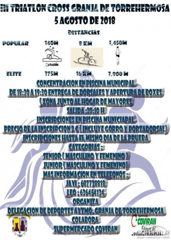 La Delegación de Deportes del Ayuntamiento de Granja de Torrehermosa organiza la celebración del III Triatlo en la localidad. En concreto, esta tercera edición se llevará a cabo el próximo domingo, 5 de agosto, y cuenta con la colaboración de Supermecado Covirán.