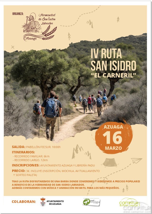 El sábado, 16 de marzo, tendrá lugar la celebración de la IV Ruta San Isidro “El Carneril” en Azuaga, actividad organizada una edición más por la Hermandad de San Isidro de la localidad.