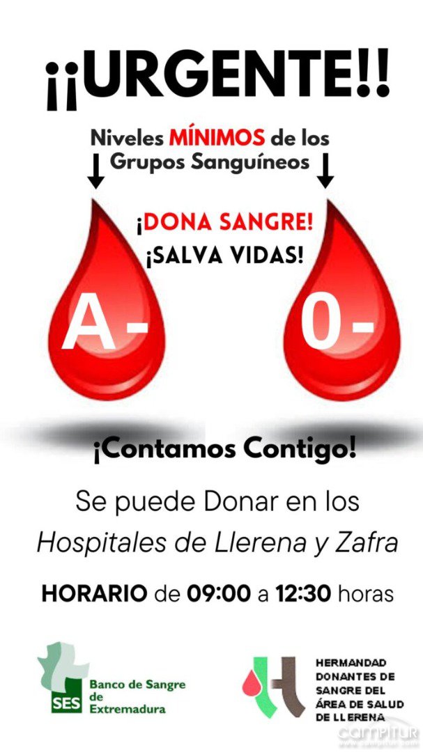 La Hermandad de Donantes de Sangre del Área de Salud de Llerena se suma a la convocatoria del Banco de Sangre de Extremadura según la cual se alerta que las reservas de los grupos sanguíneos O- y A- están muy por debajo de las cifras adecuadas.