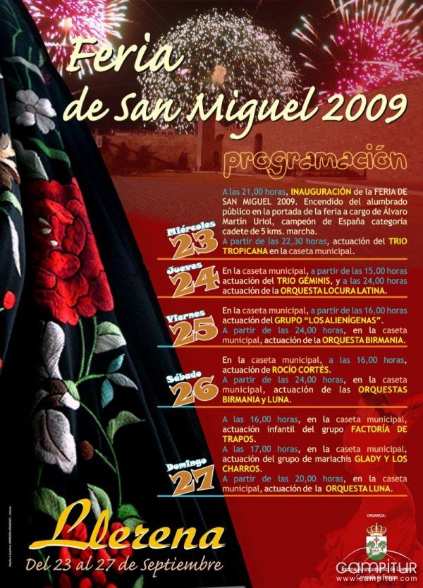 El próximo miércoles 23 de septiembre la localidad llerenense inicia su tradicional Feria de San Miguel. De esta manera, hasta el domingo 27, la ciudad se engalana y se dispone a llevar a cabo numerosas actividades con motivo de dicha festividad.