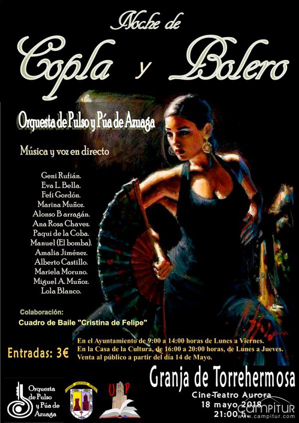 El próximo viernes, 18 de mayo, la Orquesta de Pulso y Púa de Azuaga, ofrecerá en la localidad de Granja de Torrehermosa la Gala “Noche de Copla y Bolero”, organizado por la Concejalía de Cultura del Excmo. Ayuntamiento de dicha localidad. Este espectáculo que durante las cuatro ediciones que se ha realizado en Azuaga y tres ediciones en Berlanga ha obtenido un notable éxito, tendrá lugar en el Cine-Teatro Aurora, a las 21.00 horas y se espera agotar la venta de todas las entradas y conseguir aforo completo, también en Granja de Torrehermosa.
