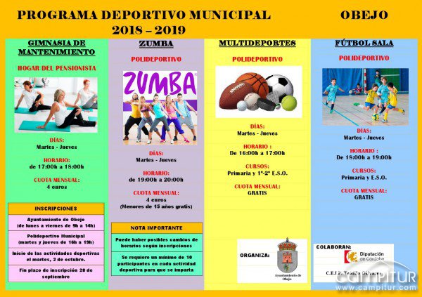 Desde el Ayuntamiento de Obejo ya se ha elaborado la programación deportiva que se impartirá a lo largo del curso 2018/2019.