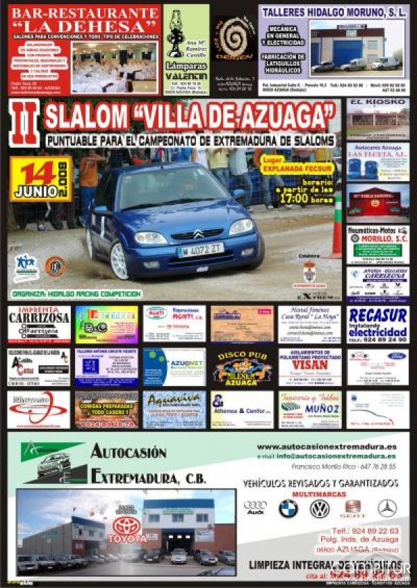 El equipo de rallys 'Hidalgo Racing Competición', con la colaboración del Ayuntamiento de Azuaga, organizó en el verano el 'II Slalom Villa de Azuaga', puntuable para el campeonato de Extremadura de Slaloms 2008. La cita fue en la explanada de Fecsur y se disputó en un circuito mixto.