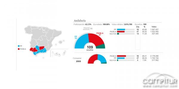 Con el 100 % de los votos escrutados, el Partido Popular se convierte por primera vez en la historia de Andalucía en la formación más votada, exactamente con más de 1,6 millones de votos. No obstante, en contra de las encuestas que vaticinaban la mayoría absoluta para la formación popular, no será suficiente. Con 50 parlamentarios se quedan bastante lejos de los 55 que les hacía falta para gobernara en solitario.