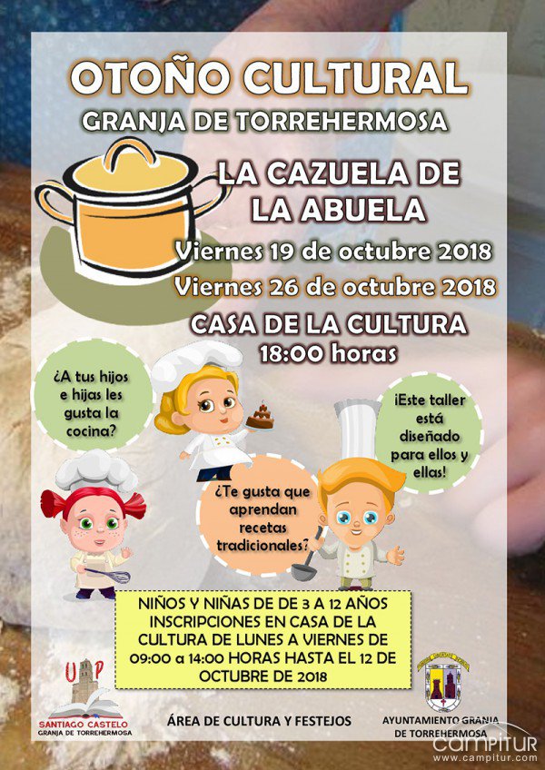 Enmarcado dentro de la programación del Otoño Cultural elaborada por el Ayuntamiento de Granja de Torrehermosa, desde el Área de Cultura y Festejos, se celebrará los próximos días 19 y 26 de octubre, un Taller infantil denominado “La Cazuela de la Abuela”.