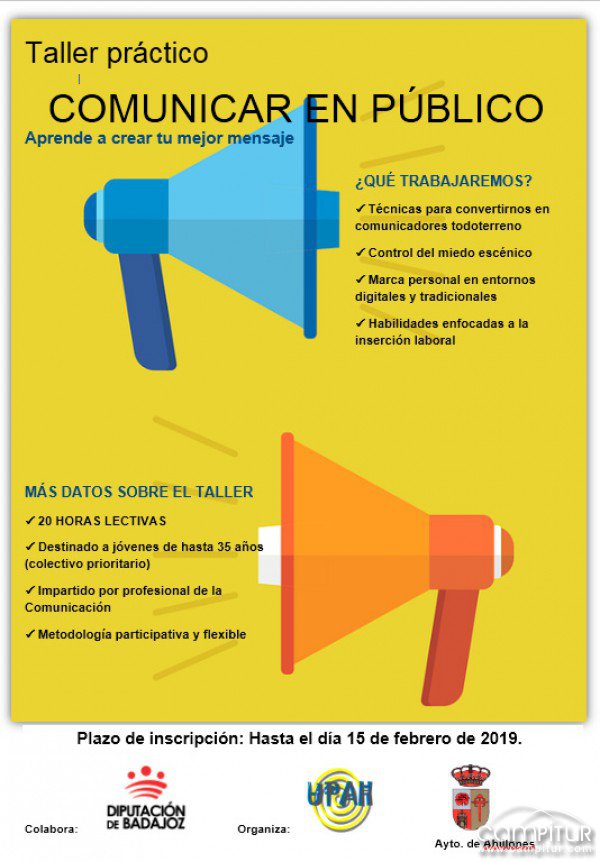 El Ayuntamiento de Ahillones informa a sus vecinos de la próxima impartición de un Taller práctico que versará sobre “Comunicar en Público”.