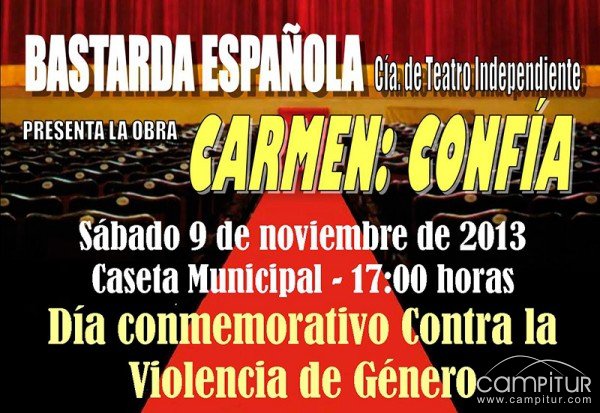 La Concejalía de Igualdad y Cultura de Villanueva del Rey, contando con la colaboración de la Diputación de Córdoba, ha organizado con motivo de la celebración del Día Internacional contra la Violencia de Género que se conmemora cada 25 de noviembre, la representación de la obra de teatro “Carmen: confía”