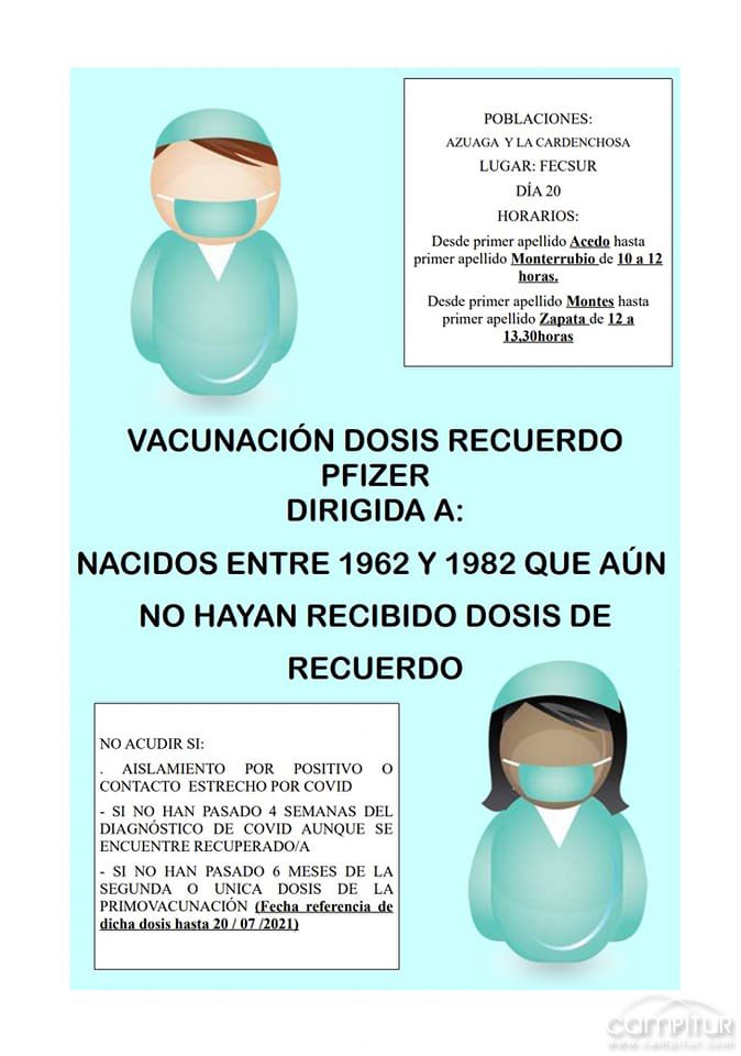 Desde el Centro de Salud informan a todos los vecinos de Azuaga y de La Cardenchosa de la reanudación esta semana de la administración de la dosis de recuerdo de la vacuna de Pfizer a todas aquellas personas nacidas entre los años 1962 y 1982, ambos inclusive, que aún no se la hayan puesto.