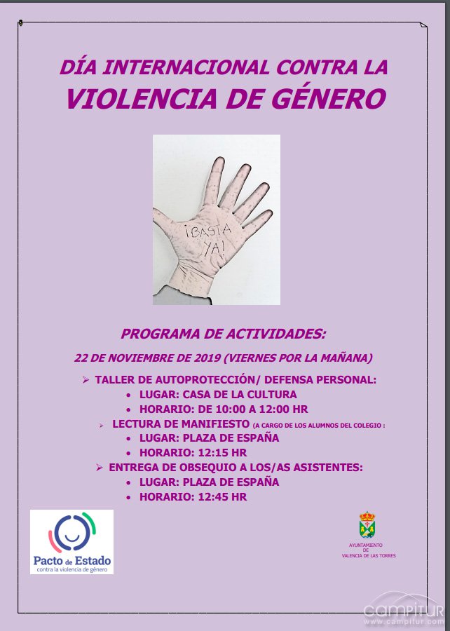 El Ayuntamiento de Valencia de las Torres se suma al Pacto de Estado Contra la Violencia de Género con un amplio programa de actividades que se desarrollarán el próximo viernes, 22 de noviembre, por la mañana.