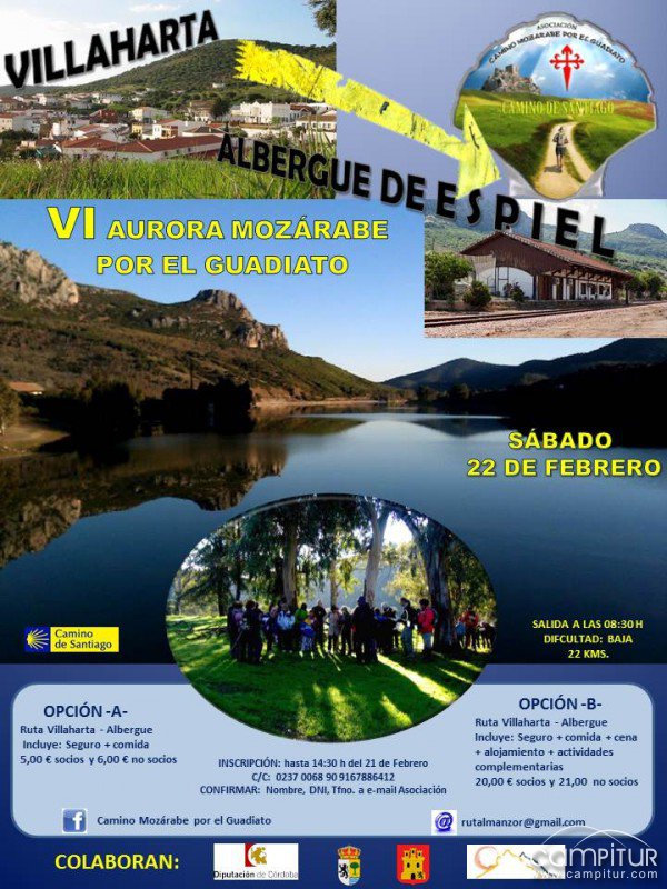 El sábado, 22 de febrero, tendrá lugar la VI Aurora Mozárabe Por el Guadiato, ruta senderista organizada por la Asociación Camino Mozárabe por el Guadiato y que cuenta con la colaboración del Ayuntamiento de Villaharta.