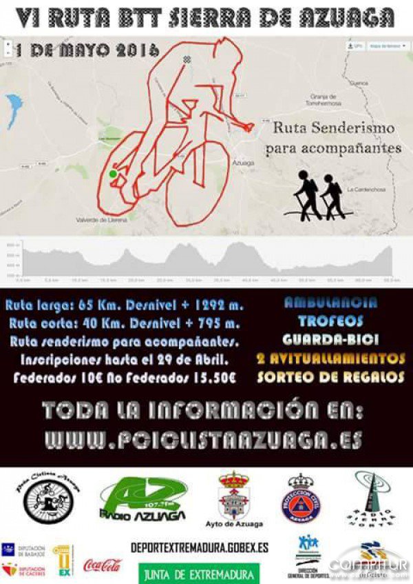 El próximo día 1 de mayo, domingo, tendrá lugar la celebración de la VI Ruta BTT Sierra de Azuaga 2015, organizada un año más por el Club Deportivo Peña Ciclista Azuaga, y enmarcada dentro del calendario regional de la Federación Extremeña de Ciclismo, dentro del circuito Dehesa de Extremadura, además de ser la octava prueba de las 14 de ciclismo que integran el circuito de la Dirección General de Deportes de la Junta de Extremadura “Naturaleza y Salud Extremadura”